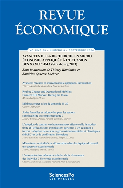 Revue économique, n° 75-5. Avancées de la recherche en microéconomie appliquée à l'occasion des XXXIXes JMA (Strasbourg 2023)