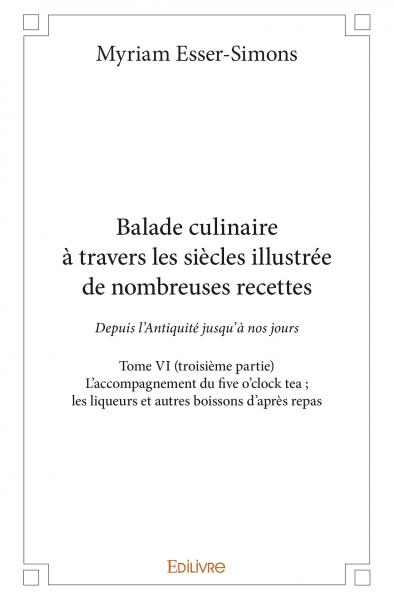 Balade culinaire à travers les siècles, illustrée de nombreuses recettes : Depuis l’Antiquité jusqu’à nos jours : L’accompagnement du five o’clock tea ; les liqueurs et autres boissons d’après repas
