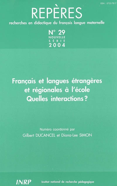 Repères : recherches en didactique du français langue maternelle, n° 29. Français et langues étrangères et régionales à l'école, quelles interactions ?